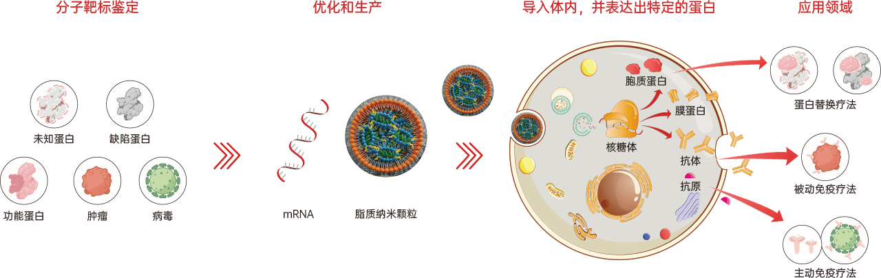 信使核糖核酸(mRNA)指导细胞合成所需的蛋白质,从而执行不同的生理功能,对生物体的生长、发育、遗传、变异等众多生命活动起着决定性的作用。mRNA在理论上能够表达任何蛋白质,因此可以探索治疗几乎所有基于蛋白质的疾病,有望为传统药物无法逾越的疾病挑战带来变革式治疗手段。